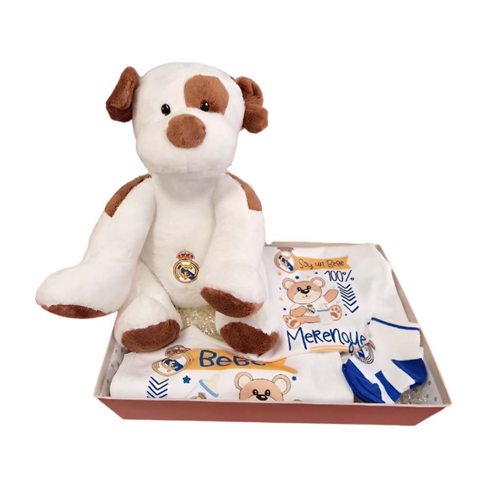 Es el obsequio perfecto para iniciar a los pequeños en su pasión por el fútbol. Compuesta por un conjunto de prendas y accesorios esenciales adornados con los colores y el escudo del Real Madrid, este set incluye un body, un babero, calcetines y un adorable perro de peluche de 30 cm. Además, viene con un diploma personalizado y una tarjeta de felicitación, todo presentado en una bandeja de cartón y envuelto en papel celofán. Ideal para baby showers y regalos de nacimiento, esta cesta no solo viste a los bebés con los colores del equipo, sino que también les da una calurosa bienvenida a la gran familia madridista.