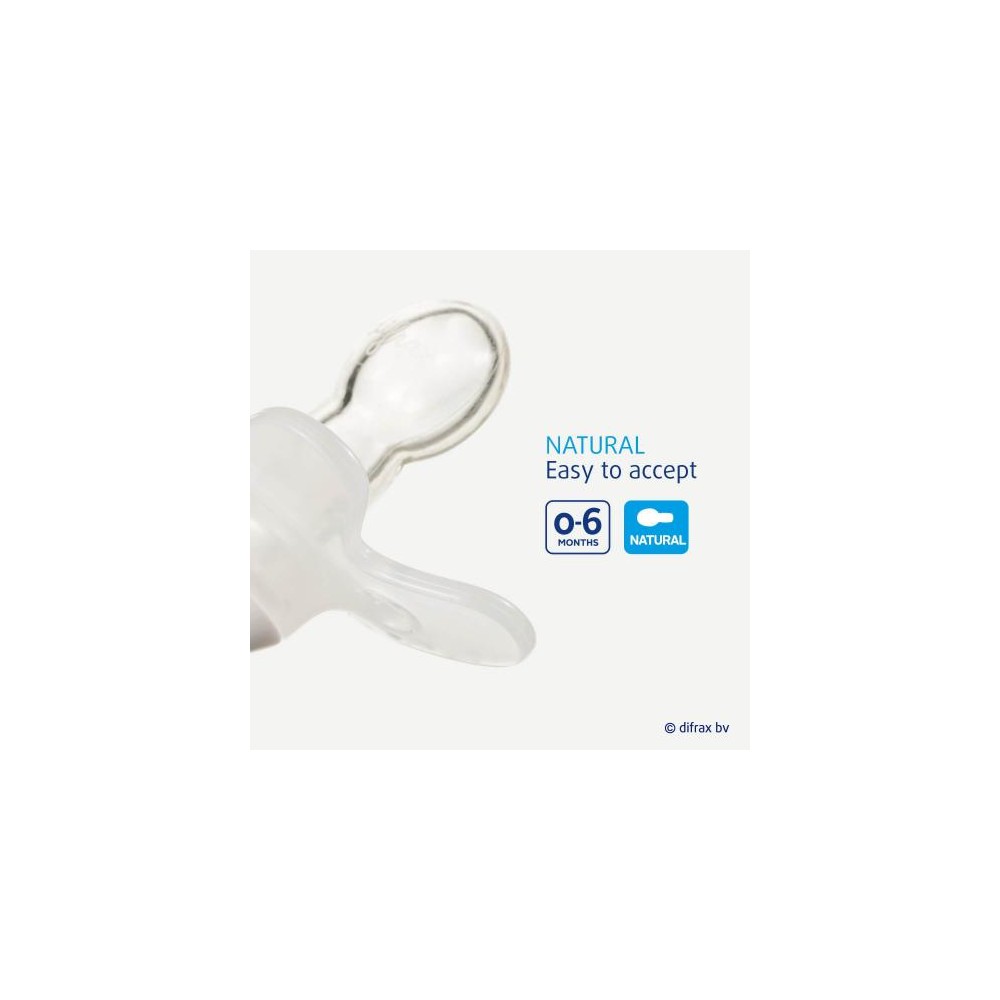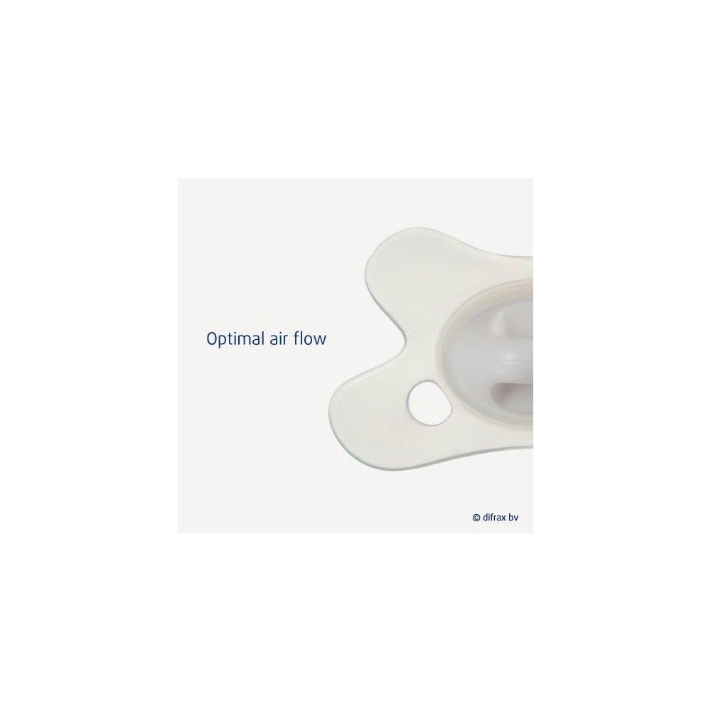 tiene un escudo en forma de mariposa que garantiza un ajuste perfecto a la cara de su bebé. El hueco para la nariz permite que su bebé respire libremente por la nariz. Dos orificios ventilados en cada lado proporcionan un flujo de aire adicional, evitando la irritación de la piel. El chupete ofrece a tu bebé comodidad, paz y relajación.