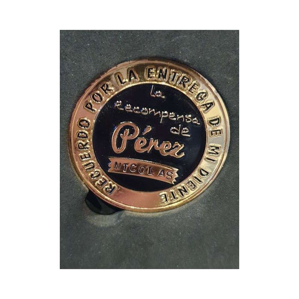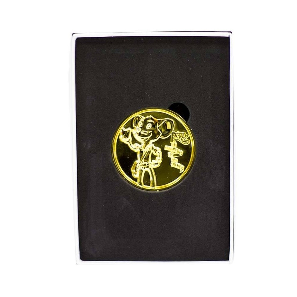 Una maravillosa Moneda del ratón Pérez, de Recuerdo de la entrega de su primer Diente, es de metal macizo con un peso de 50 grs. bañada en un delicado cromo dorado (simil Oro) y con la figura del ratoncito Pérez y la frase en relieve.