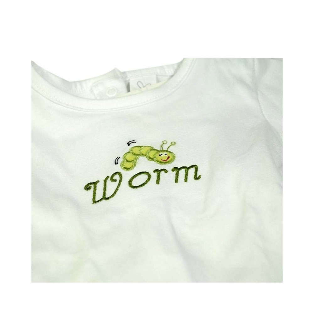 Este conjunto especial para las tardes de paseo, está compuesto por un Jersey de manga larga en color blanco, cerrado en la espalda con broches automáticos y lleva un delicado bordado en el pecho de Worm.