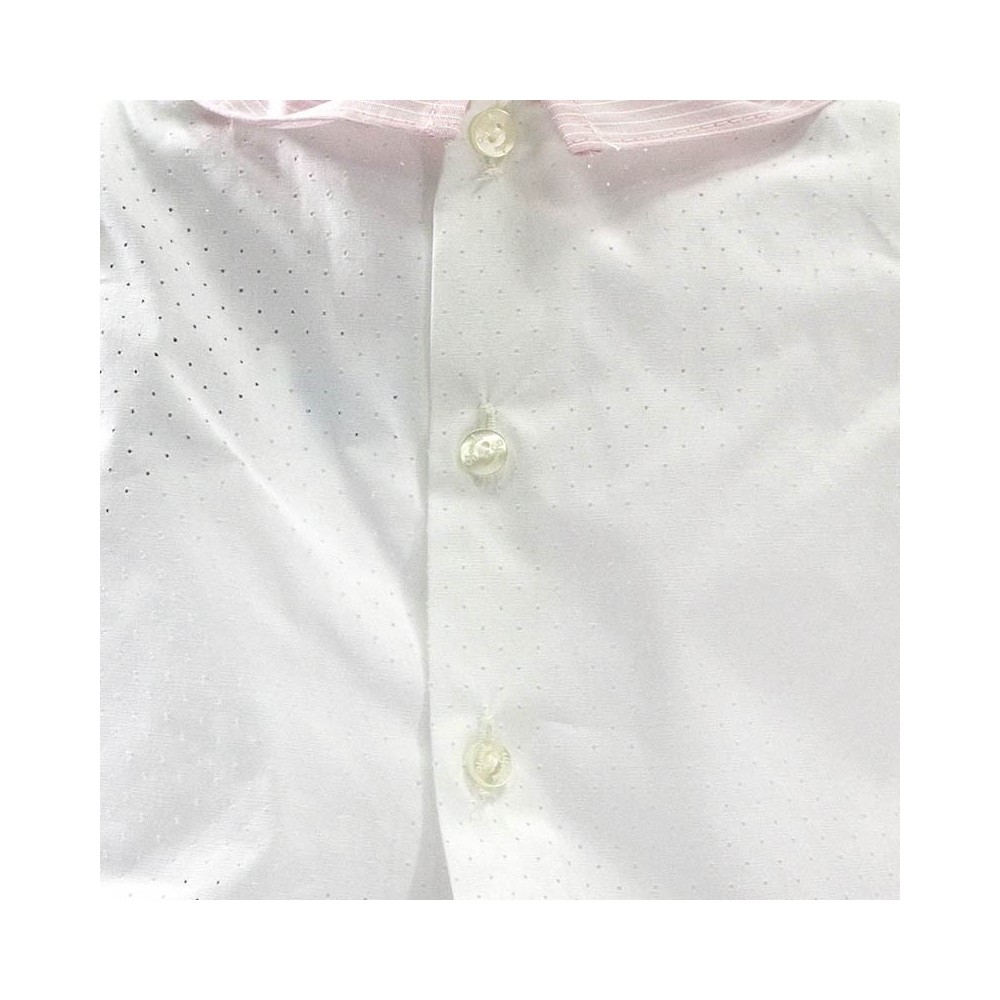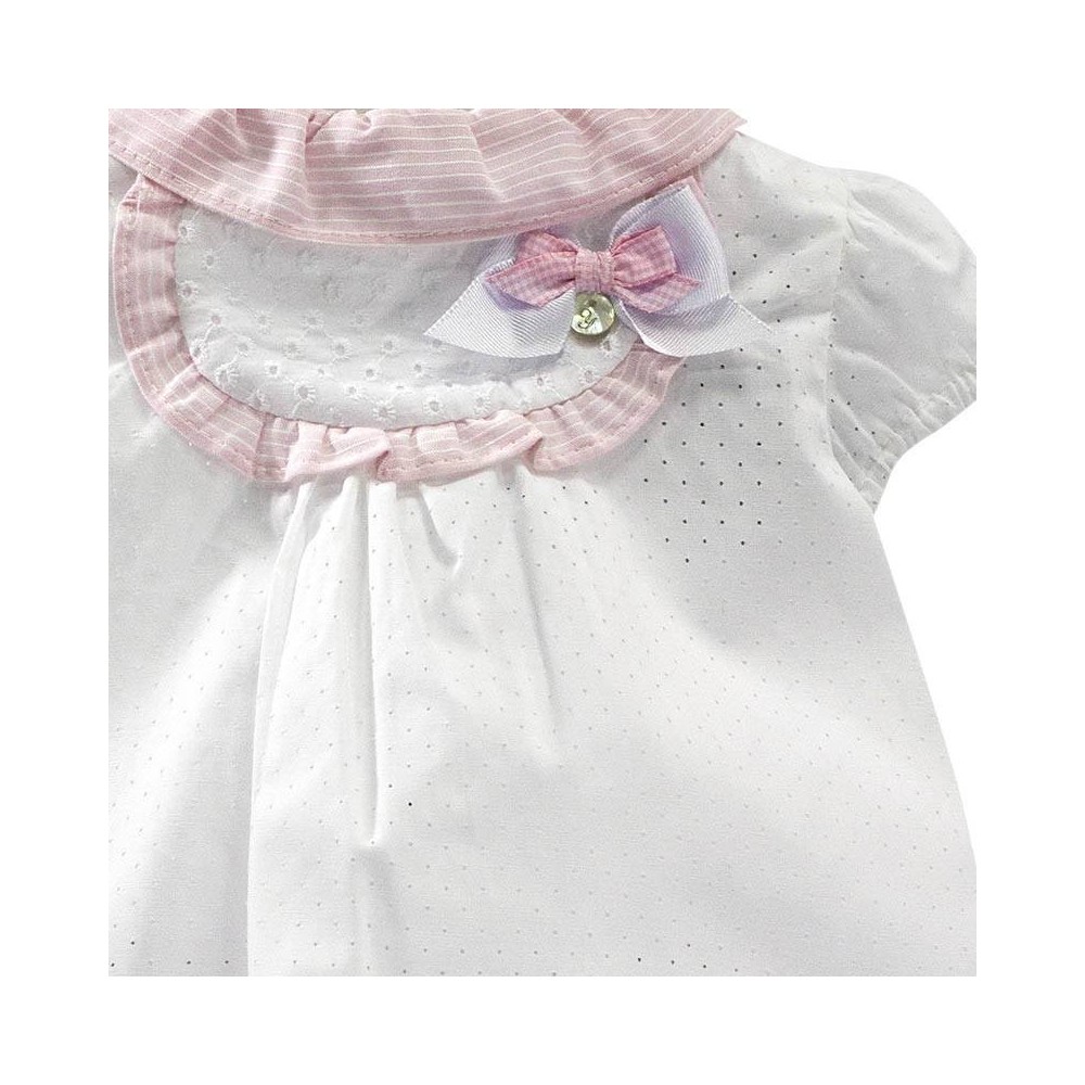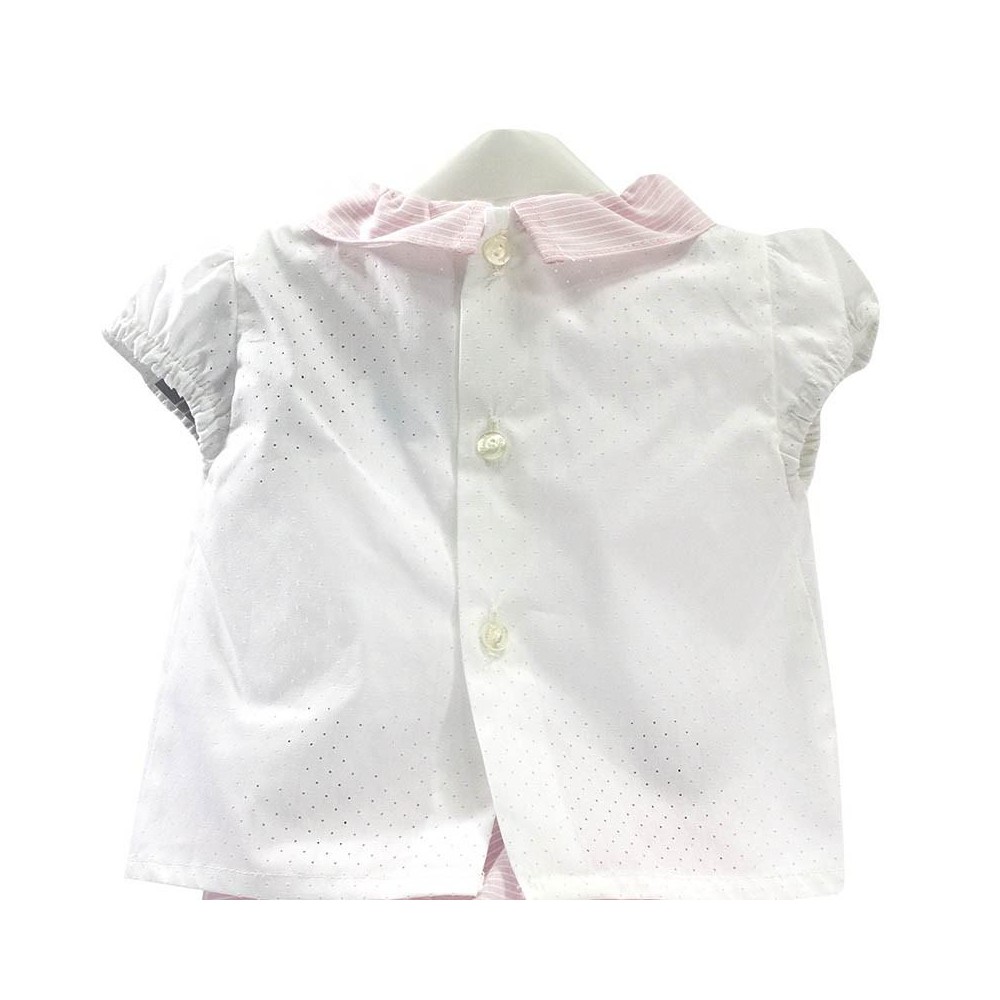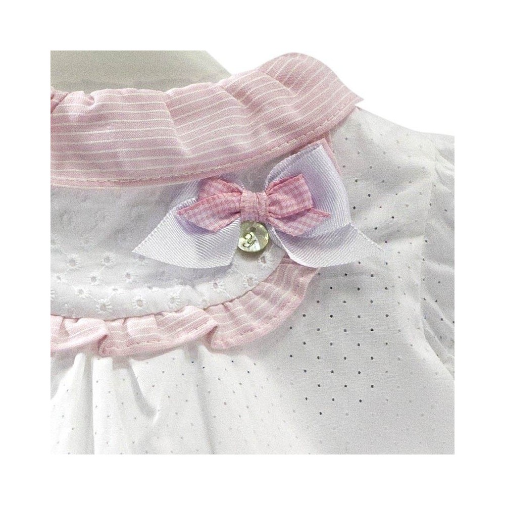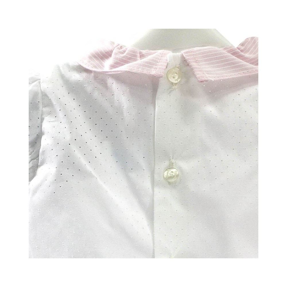 Compuesto por una elegante camisa blanca en tejido de algodón 100% de alta calidad de textura suave, fresca y calada. Con un delicado detalle en el cuello y la pechera en color rosa palo con finas rayitas blancas a juego y decorado con unos lazos en cintas de raso en color rosa y blanco con un detalle de botón nacarado.