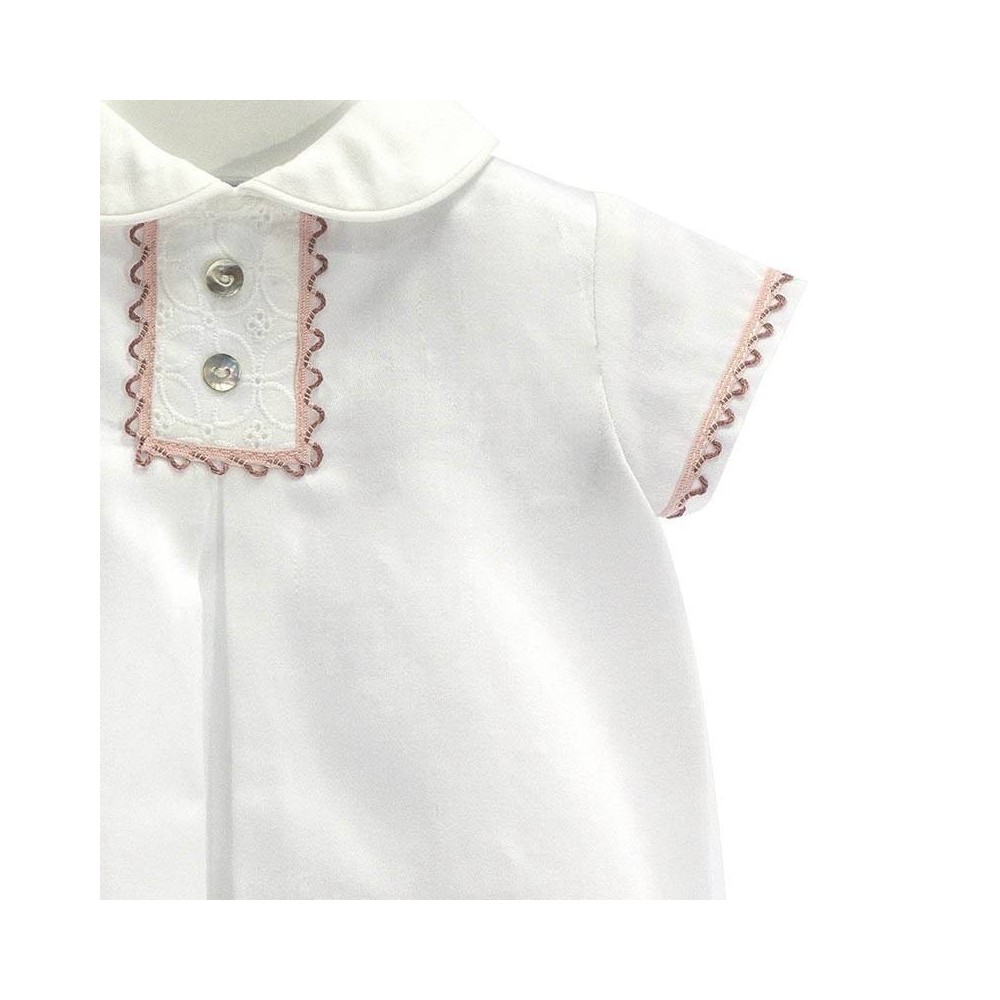 Este delicado conjunto Marsala para niño está compuesto por una bella camisa blanca con cuello redondo de la misma textura fina y suave del mismo color, con un delicado detalle en el centro y ambas mangas cortas con piquillos haciendo juego en color rosa palo y bourdoux y dos botones (simil nácar) en la pechera y un pliegue central que le da una elegante y fresca forma acampanada.