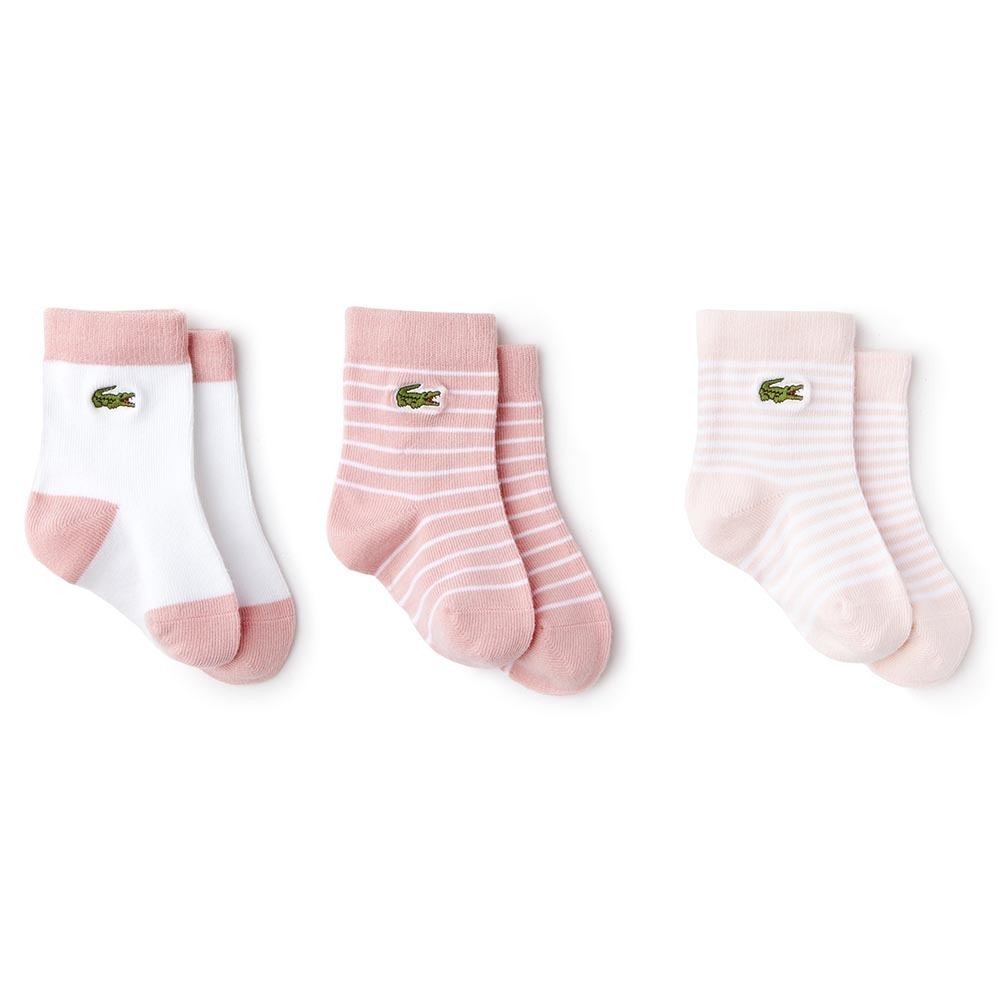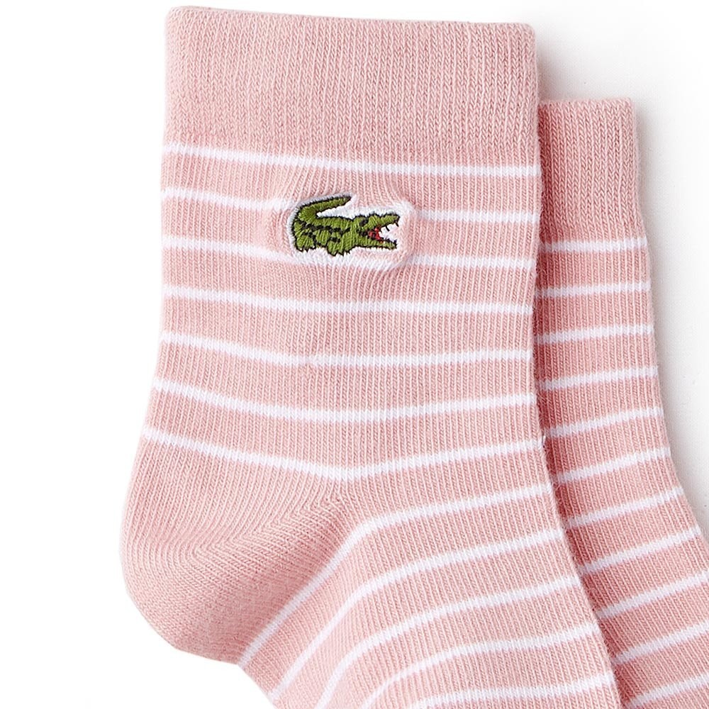 son unos preciosos calcetines en bicolor o rayas, presentados en una original cajita de cocodrilo y con el bordado caracteristico del cocodrilo verde de LACOSTE.