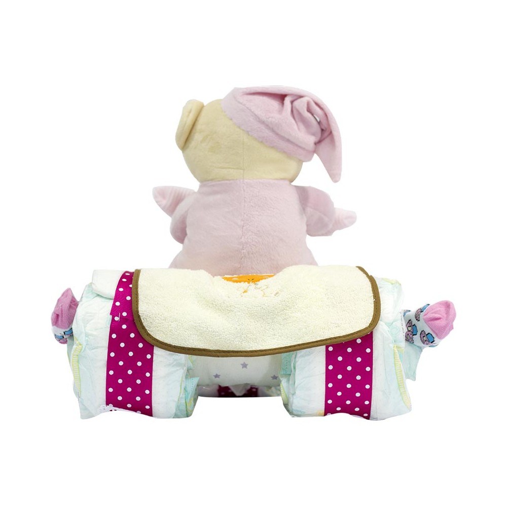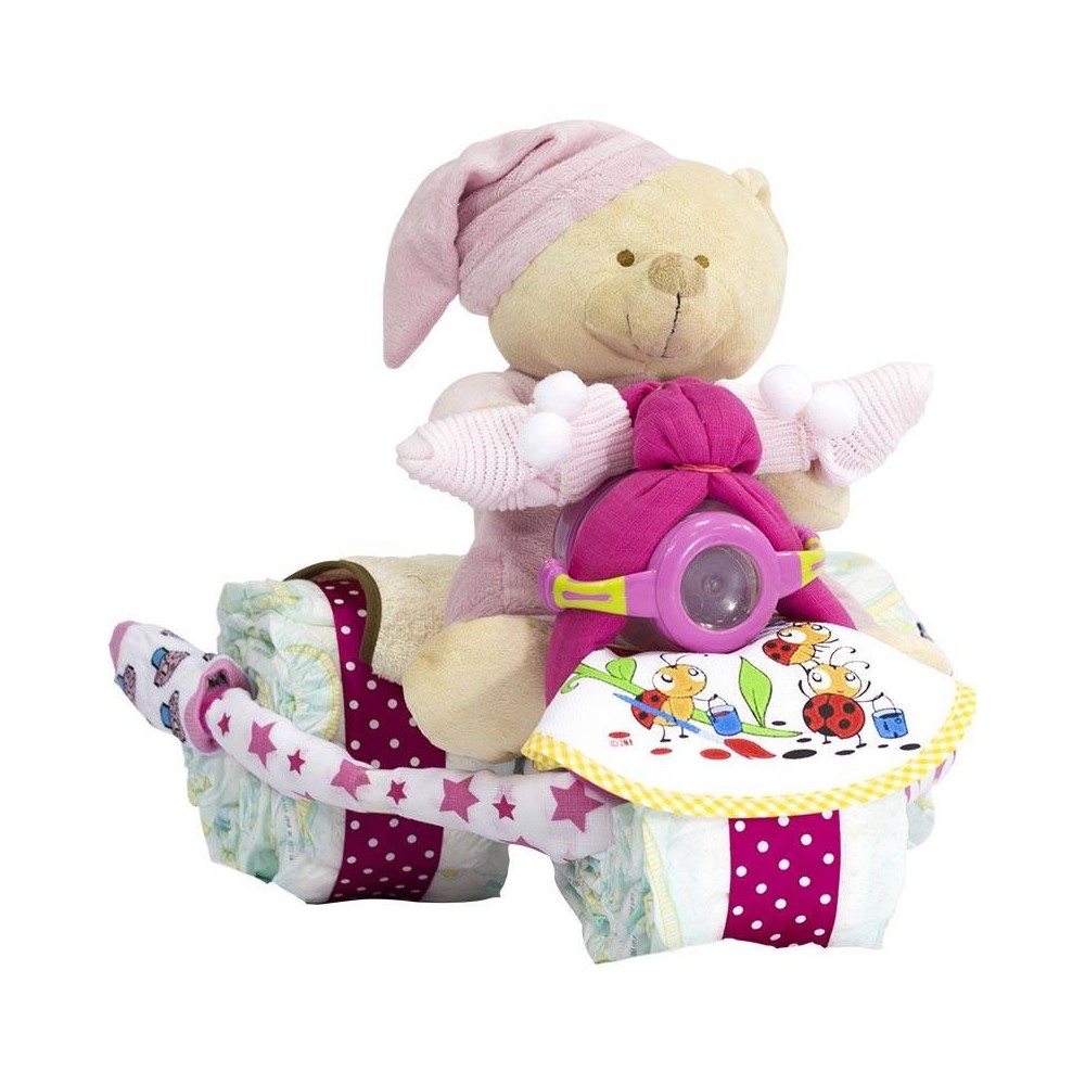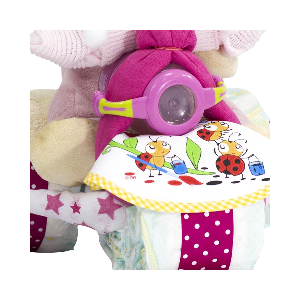 El Triciclo de Pañales contiene productos de gran utilidad para el Recién Nacido, como sus Patucos y calcetines de suave algodón 100%, las gasitas, ideales para las tomas, las babitas etc.